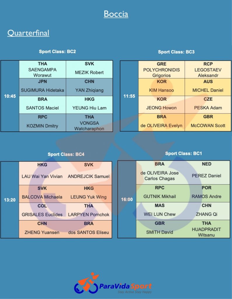 Finally, the BC4 class will begin competing at 13:20. Unsurprisingly, Slovakia will be in the limelight thanks to its two competitors, Michaela Balcova and Samuel Andrejcik, who won gold in pairs in Rio and will face two Hong Kong athletes, Vivian Lau and Yuk Wing Leung.